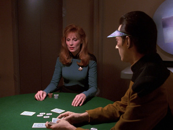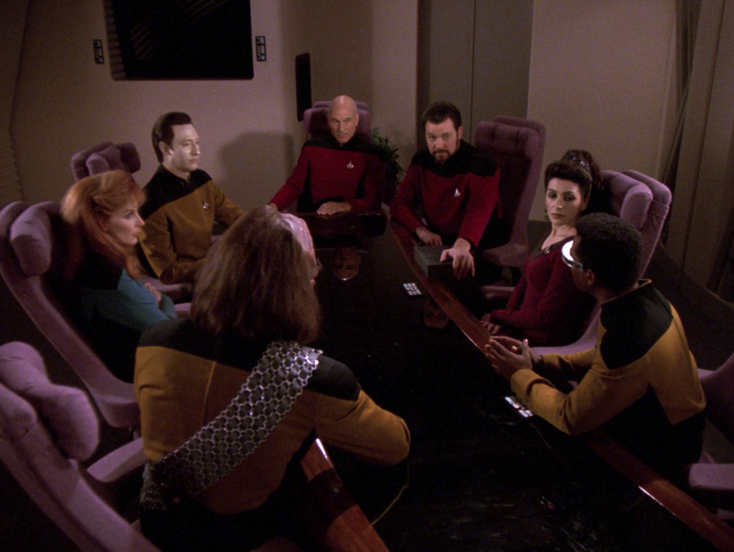 What makes this episode stand out is how the characters gradually become aware of the loop through subtle clues, like Geordi’s dizziness caused by his visor’s neural input distortions and overlapping voices recorded during the loops. Data and Geordi work together to send a cryptic message encoded in a Dekyon field to their future selves, hoping to break the cycle. The message is designed to be understood only at the critical moment to avoid altering events prematurely, which adds a layer of complexity to the plot.