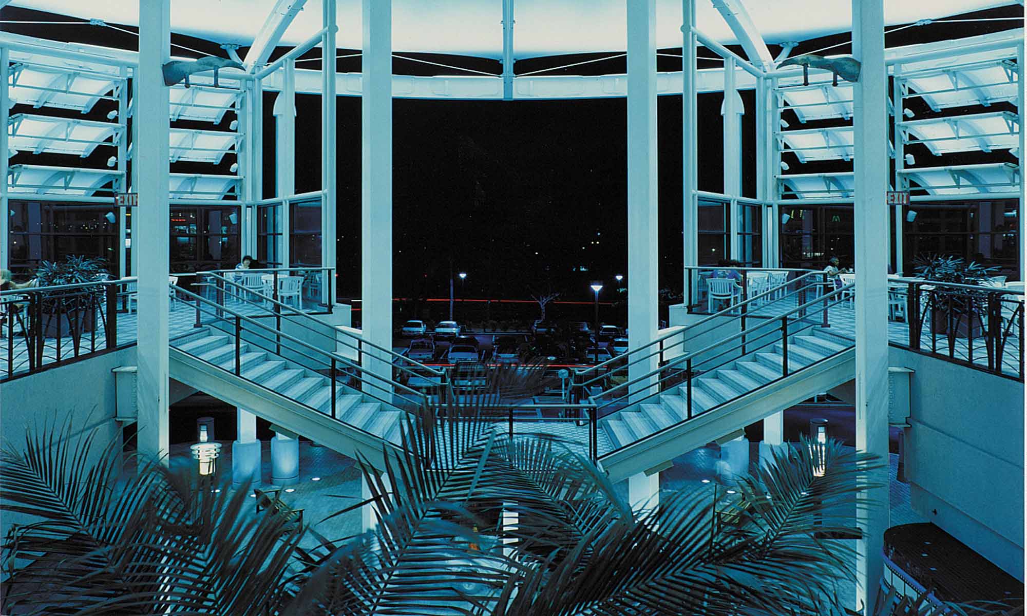 Modern shopping center with vibrant architecture and palm trees.