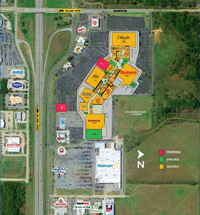 Shawnee Mall, located at 4901 N Kickapoo Ave in Shawnee, Oklahoma, is a vibrant shopping destination that offers a wide variety of stores and entertainment options. This spacious mall covers over 455,000 square feet and features major anchors like Dillard’s, Kohl’s, Mathis Brothers, and AMC Theaters, making it a central hub for shopping and leisure in the area. It sits conveniently along Interstate 40, right next to a Walmart Supercenter, which adds to its accessibility and appeal for both locals and visitors.