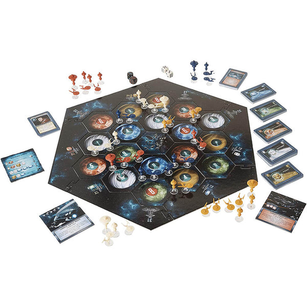 Players start by placing outposts and starships on the board, with each outpost connected to three planets that produce resources. Upgrading outposts to starbases and using support cards featuring Star Trek characters like Scotty and Spock add strategic depth. The components are well-made, with sturdy starship models and detailed outposts that enhance the experience for fans and newcomers alike. While it doesn’t dive deeply into starship battles or complex sci-fi themes, Star Trek Catan offers a familiar yet fresh way to enjoy Catan with a beloved franchise twist.
