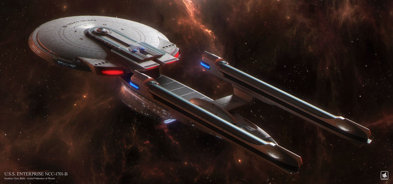 The USS Enterprise NCC-1701-B is an Excelsior-class starship launched in 2293 from the Federation spacedock NAR-30974. It measures an impressive 467 meters in length, making it significantly larger than its predecessor, the Constitution-class Enterprise NCC-1701-A. This vessel was the fourth Starfleet ship to carry the famous Enterprise name and was the fifth Excelsior-class ship to enter service. While it followed the general Excelsior design, the Enterprise-B featured some notable upgrades, including two additional impulse engines on its saucer section, totaling four, which enhanced its maneuverability. The engineering hull was also redesigned with wider decks to accommodate more lab space and advanced sensor arrays.