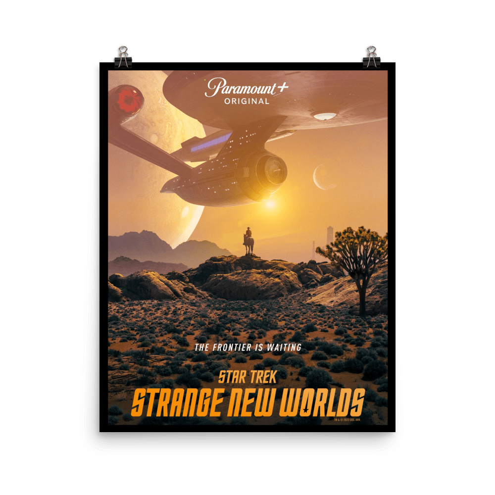 The original poster for Star Trek: Strange New Worlds beautifully captures the spirit of the series with a striking blend of classic and modern imagery. It features Captain Christopher Pike on horseback against the warm, desert hues of the Mojave, with the iconic USS Enterprise looming in the alien sky above. This imagery evokes a sense of adventure and exploration, paying homage to the show’s “space western” roots envisioned by Gene Roddenberry. The horse, possibly Pike’s beloved Tango from the original series pilot, adds a nostalgic and human touch to the futuristic scene. The poster’s colors transition from earthy golds to vibrant greens, symbolizing the bridge between humanity’s past and its bold journey into the cosmos. Many fans consider this poster one of the most evocative and romantic representations of the Star Trek franchise, perfectly embodying the theme of boldly going where no one has gone before. It’s a powerful visual reminder of the enduring legacy and ongoing excitement of Strange New Worlds.