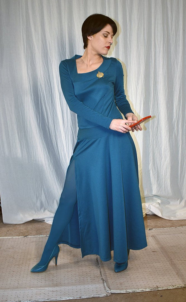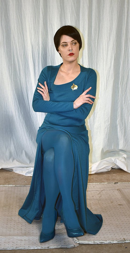 Cosplayers love recreating this outfit because it’s both stylish and comfortable, often tailor-made to fit perfectly. The dress typically features a slit and is paired with blue pumps and accessories like a communicator pin and a phaser to capture the full essence of Troi’s uniform. Its deep blue color and simple elegance make it stand out among Star Trek costumes, blending futuristic design with a touch of classic sophistication.