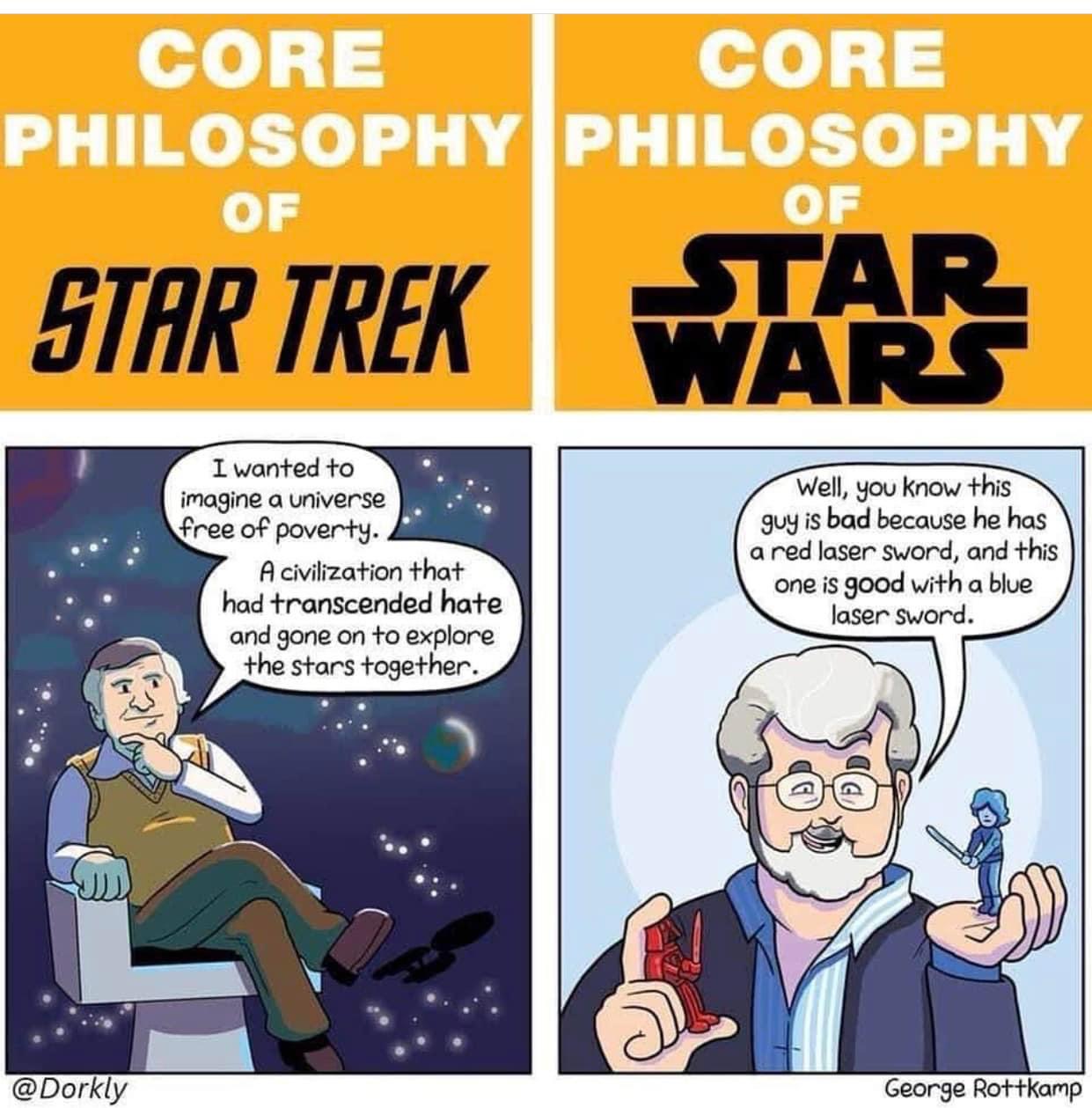 The Star Trek vs. Star Wars meme battle is a hilarious reflection of one of the most famous rivalries in pop culture. These memes capture the playful yet passionate debates between fans of the two iconic sci-fi universes, often poking fun at their differences. Star Wars is known for its epic space battles and mystical Force powers, while Star Trek emphasizes technology, exploration, and moral dilemmas. Memes highlight these contrasts with witty comparisons—like lightsabers versus phasers or the Millennium Falcon versus the Enterprise—making the rivalry both entertaining and relatable.