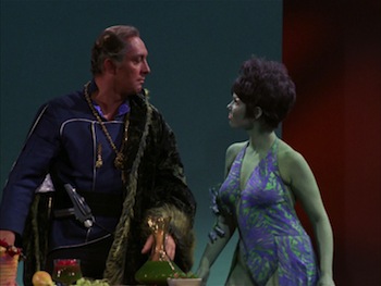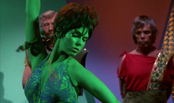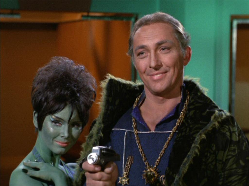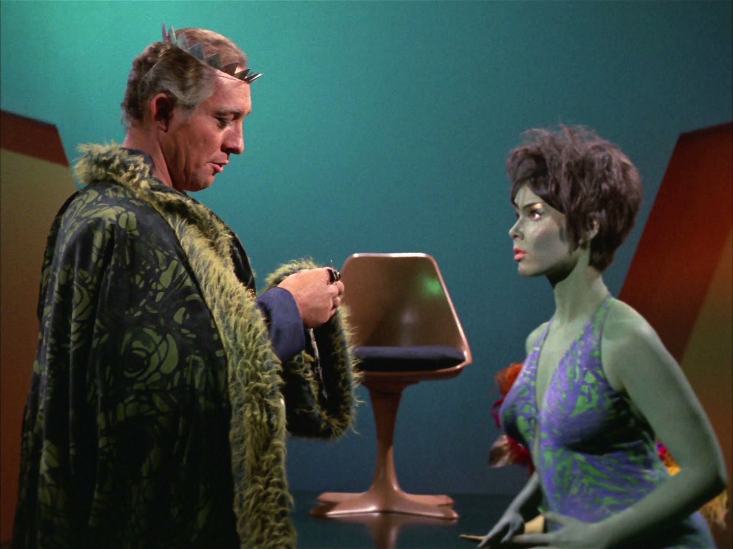 One of the standout characters is Marta, a green-skinned Orion woman and inmate who is delightfully camp and unpredictable. She flirts with Kirk and adds a quirky energy to the episode, even reciting a poem she claims to have rewritten despite it being Shakespeare’s work originally. Marta’s volatile relationship with Garth adds tension, culminating in a grim moment when Garth kills her in a fit of rage to prove his ruthlessness.