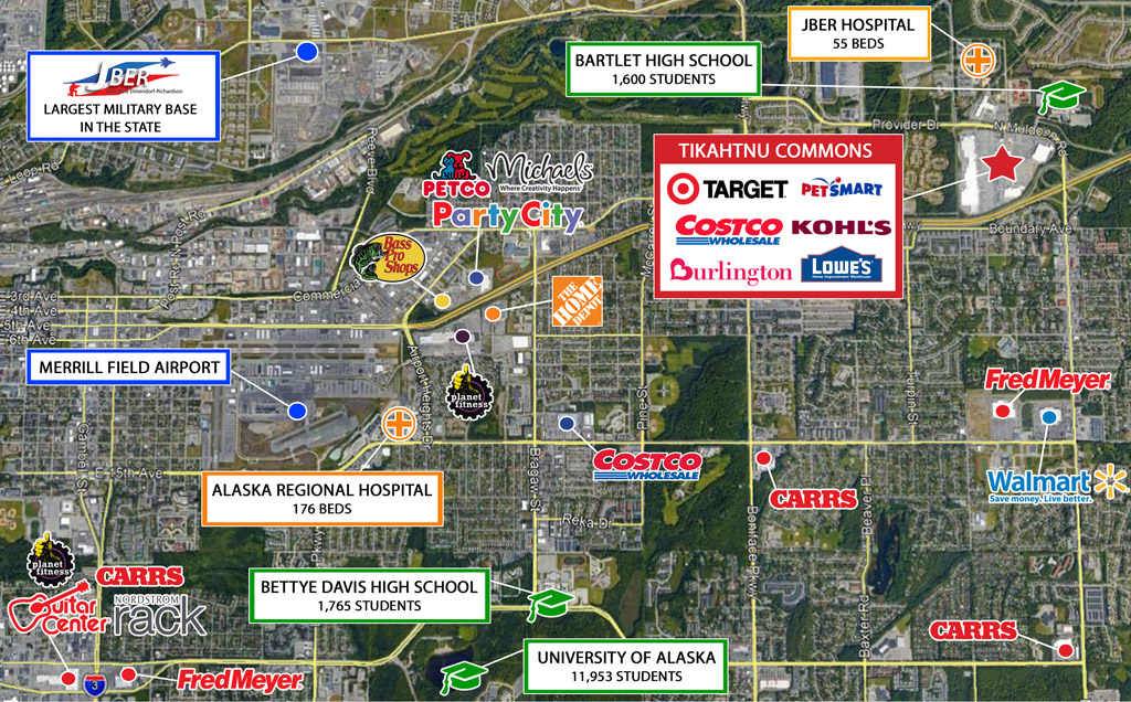 Tikahtnu Commons, located at 1142 N Muldoon Rd in Anchorage, Alaska, is a vibrant shopping destination that serves as a major retail hub for east Anchorage. This expansive center spans 85 acres and features popular anchors like Target, Lowe’s, Costco, Kohl’s (the only one in Alaska), and a Regal IMAX theater, which is the only IMAX in the state. With around 46 stores, shoppers can find a diverse mix of retail options including Best Buy, Burlington, PetSmart, Old Navy, and ULTA, alongside a variety of dining choices such as Texas Roadhouse, Red Robin, and Panda Express.
