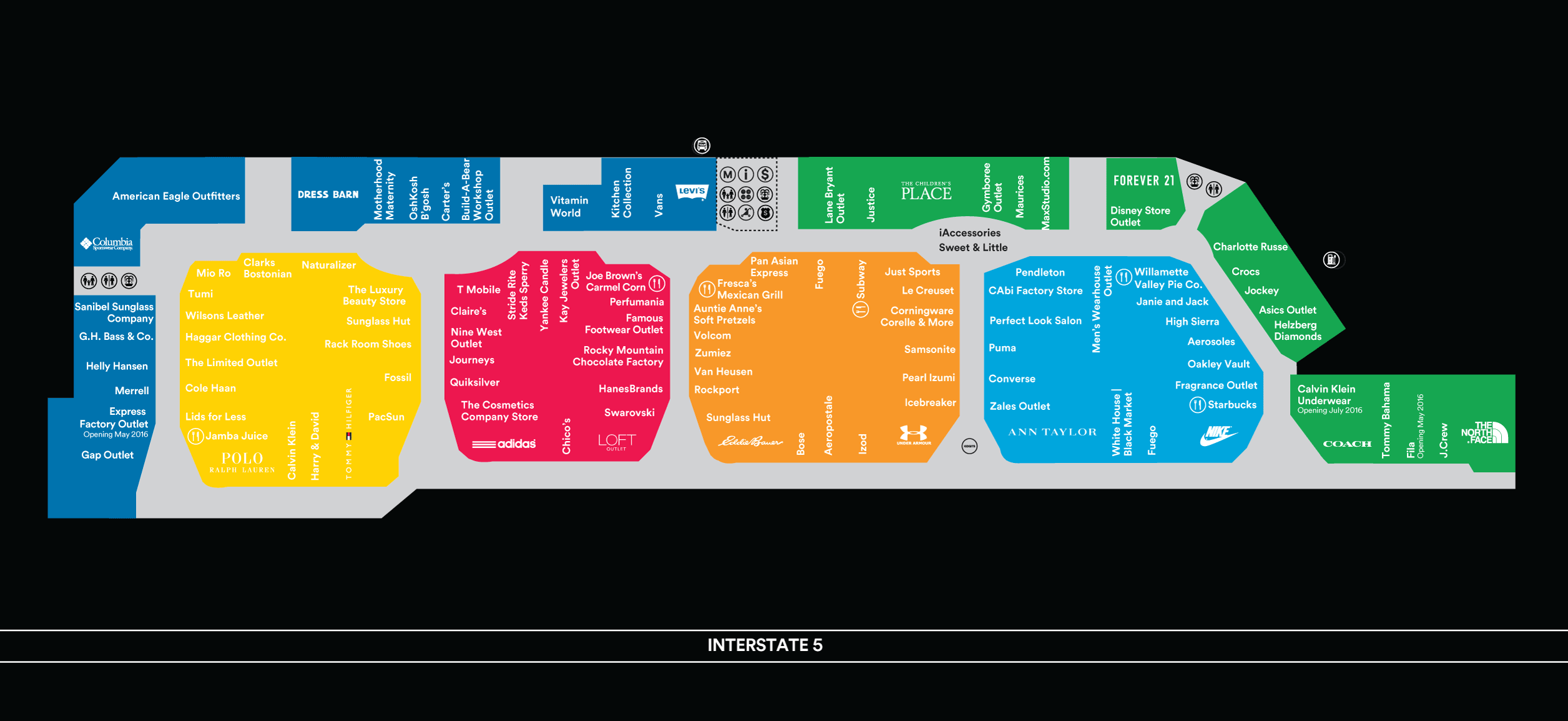 Shops and storefronts at Woodburn Premium Outlets.